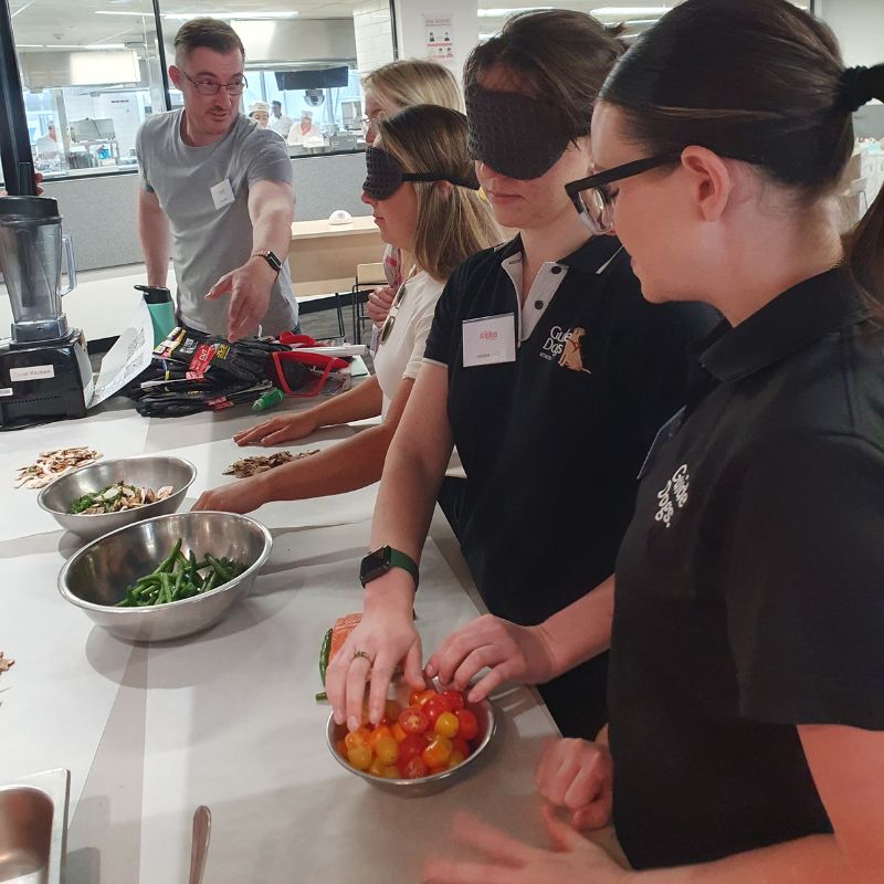 The Occupational Therapists of Guide Dogs hosted a two-part workshop where they taught staff and students to prepare a home-cooked meal while blindfolded. The training was designed to enable and engage vision-impaired and blind people to start cooking at home. Staff and students relied on verbal instructions (and a lot of trust!) to serve delicious meals such as Salmon Fillet en papillote, mushroom risotto and hummus.