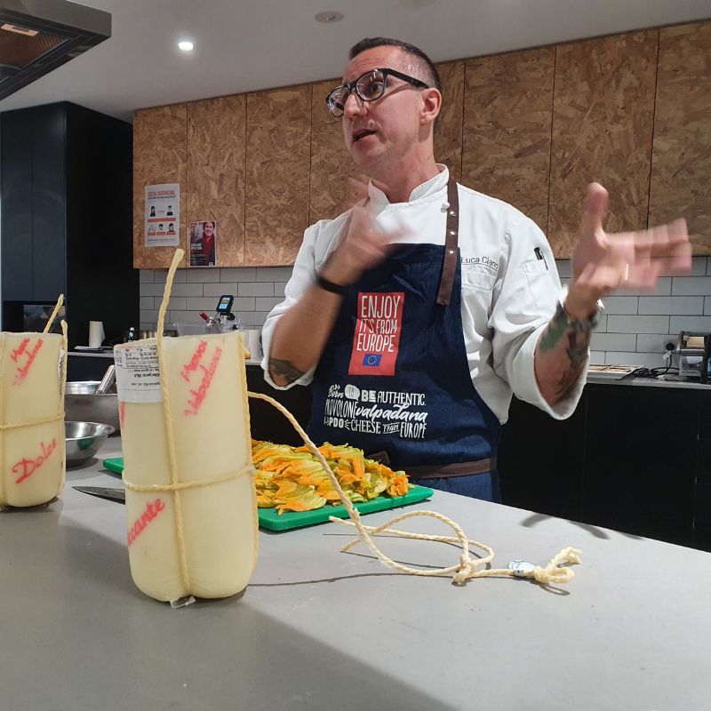 Over 60 students had the pleasure of attending the Provolone Valpadana PDO masterclass hosted by Milan-based chef and Provolone cheese aficionado Luca Ciano. During the masterclass, Luca assisted students in identifying flavours from his region in Italy by offering samples of Provolone Valpadana PDO, a delicious cheese similar to mozzarella that can be lactose and gluten-free. After mastering the different flavour profiles, students were given samples of Luca's creations, such as mild provolone fonduta, zucchini flowers and aged balsamic vinegar risotto and asparagus, baby leeks and hazelnuts and served with foamed Provolone Valpadana.