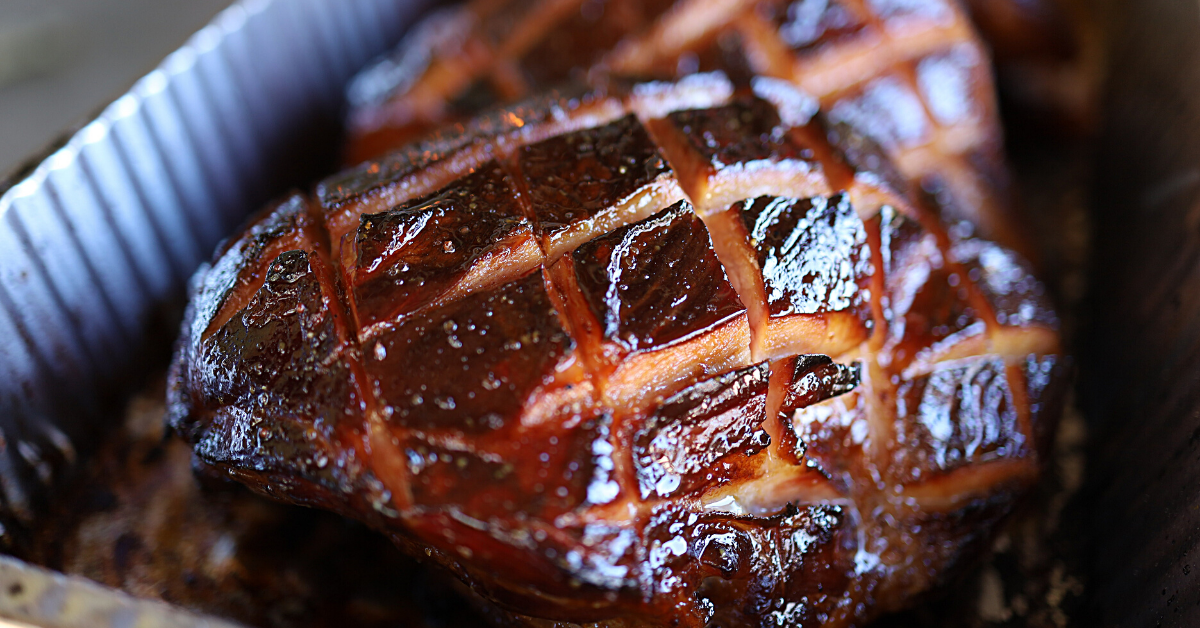 - Once fat is removed score the ham with large diamonds about 5mm deep, liberally brush pineapple reduction over the scored ham, repeat this process a couple of times. Whatever is left over from this can be added to your glaze mix.