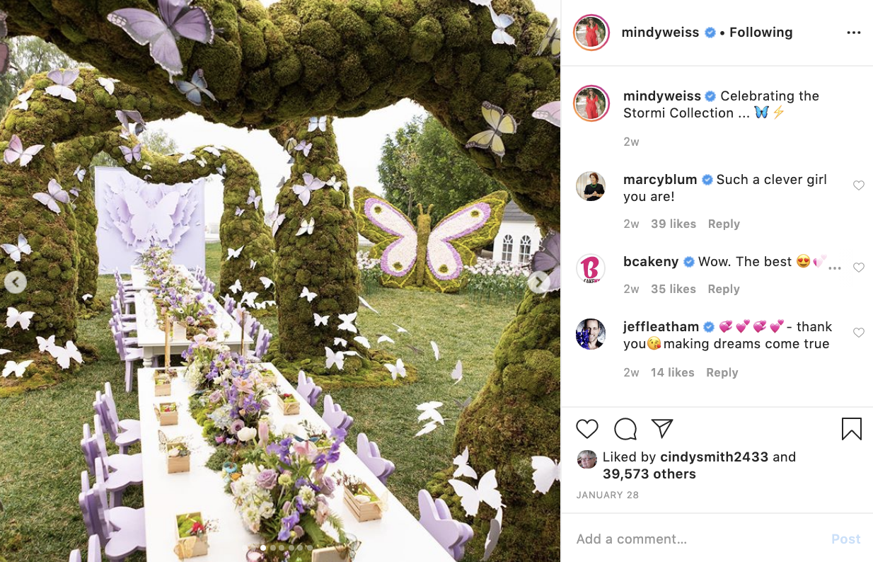 You may not know her name, but you've definitely seen her work as you scroll through IG. Mindy Weiss is the person responsible for many iconic Kardashian events and parties (Kourtney Kardashian's Into The Woods themed Christmas party and Stormi's 2nd birthday - double tick!!). Follow her IG for your next event #inspo.