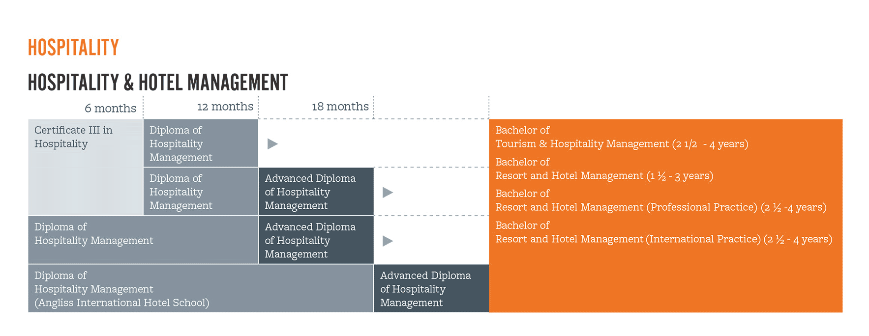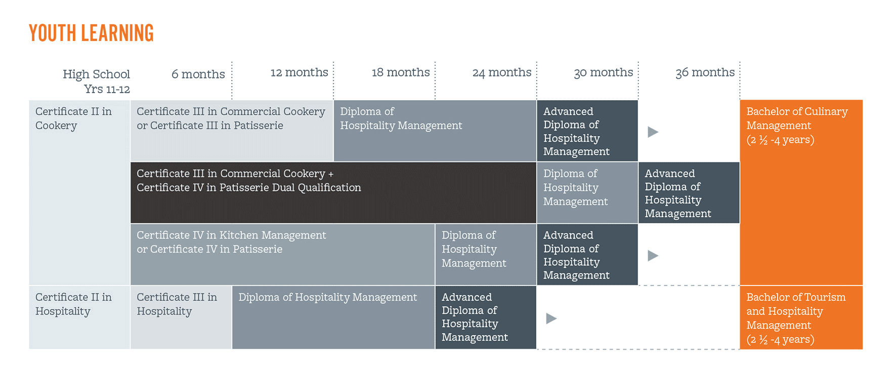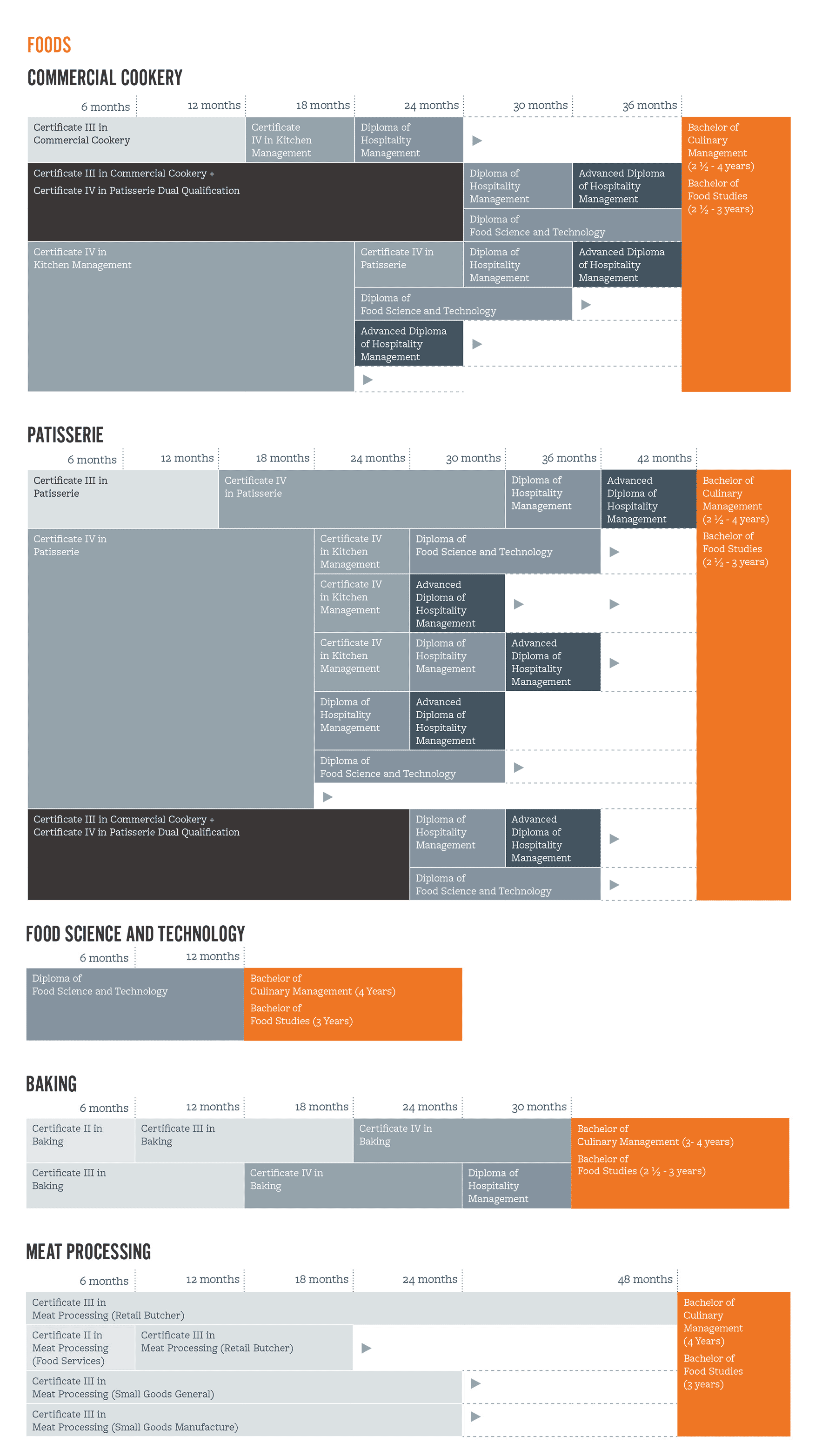 There are many entry and exit points to allow flexible learning and pathways that match your needs. See the chart below for the multiple ways you can progress through William Angliss Institute into employment or further study.